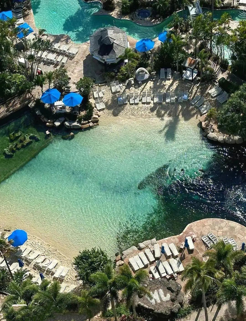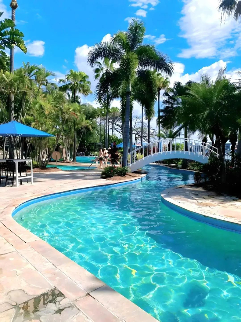 设有泻湖泳池、淡水泳池、池畔岩洞、儿童滑梯等游乐设施