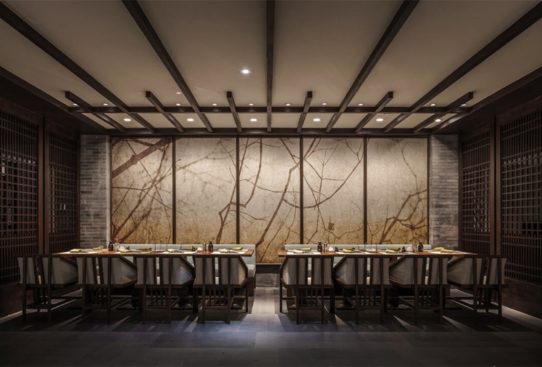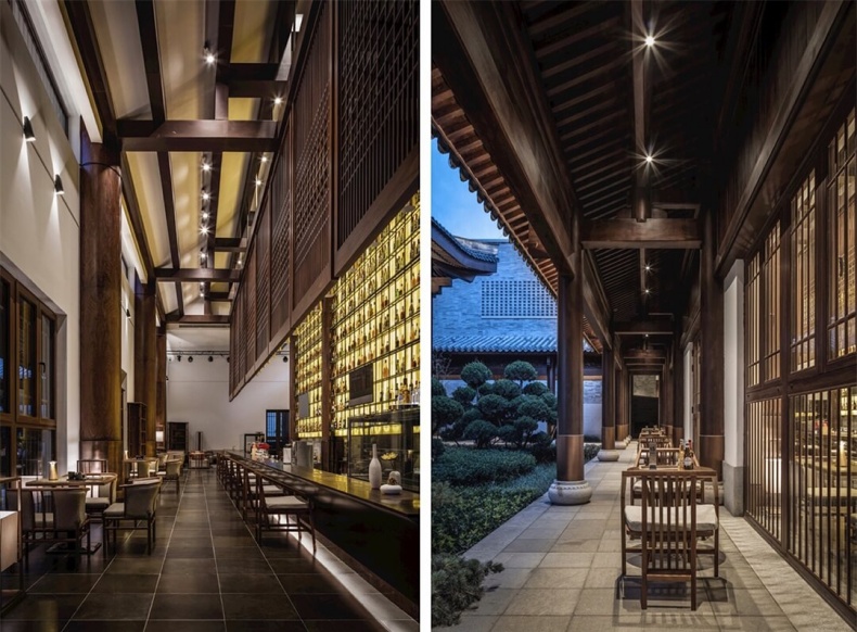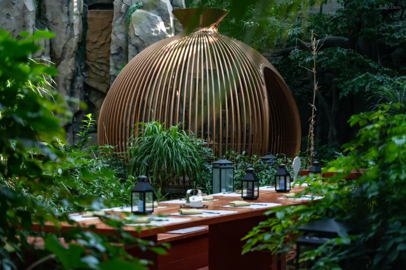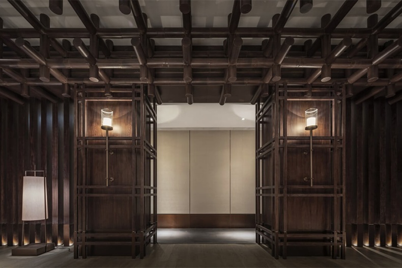 传统亭台楼阁的设计风格,木材、石头、黄铜的配色