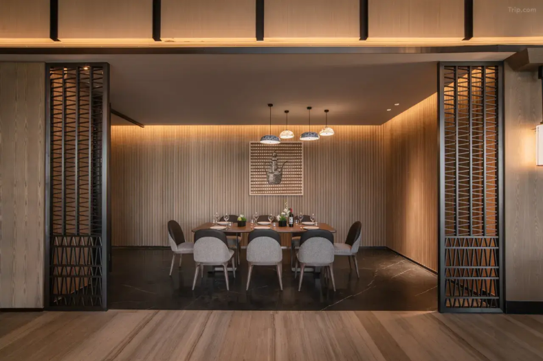 中餐包间氛围私密雅致,可欣赏户外园林和水系景观