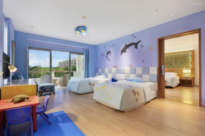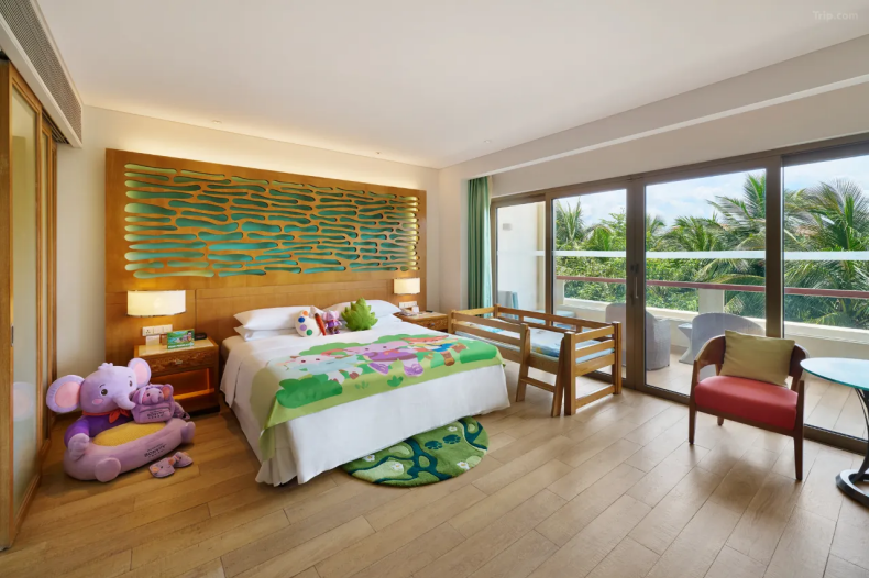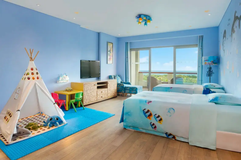 设有海洋主题的4大2小家庭套房、小黄鸭和贝亲主题亲子房等特色房型