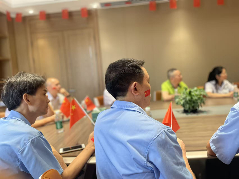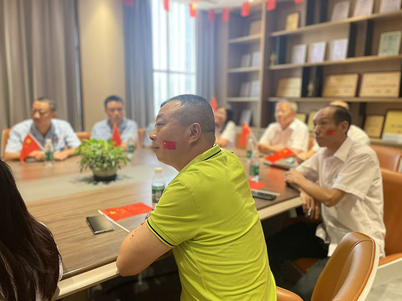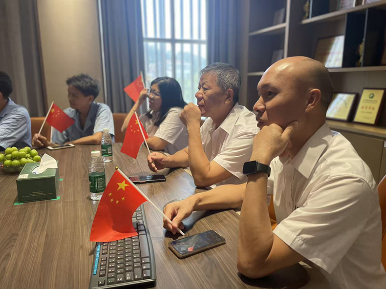 度高酒店家具总部二楼会议室座无虚席,鲜艳的五星红旗悬挂,员工们自发举着小红旗,目光齐刷刷聚焦在直播屏幕上。当礼炮鸣响、国旗护卫队迈着正步走向升旗台时,全场不约而同起身肃立,跟着旋律高唱国歌。