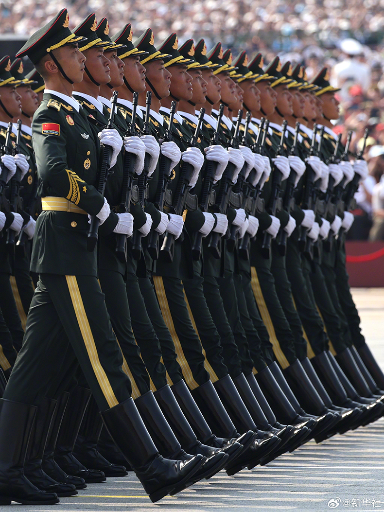 上万人受阅、45个方(梯)队、上百架飞机、数百台地面装备、80面战旗方队、千人联合军乐团、新锐重器首次亮相,威武雄壮,铁骨铮铮;气势如虹,国威凛凛。